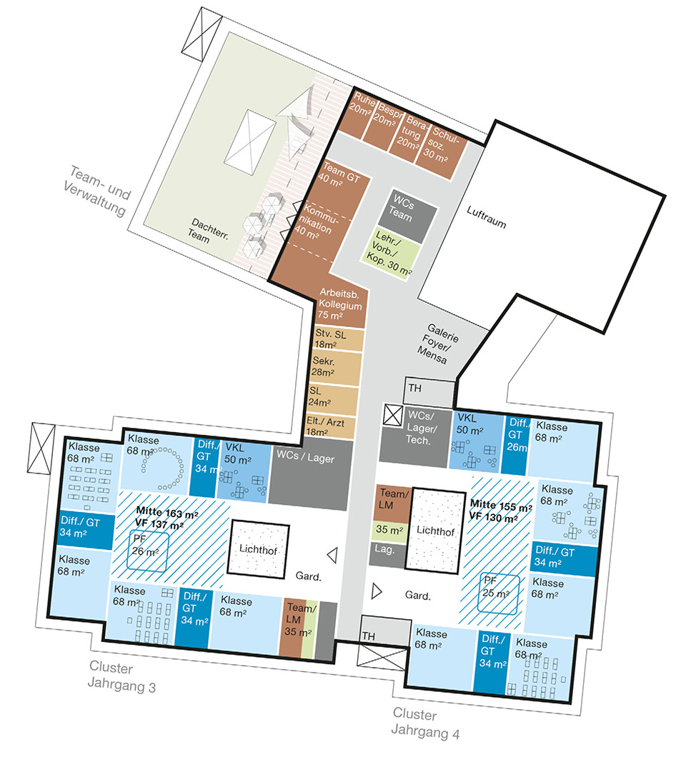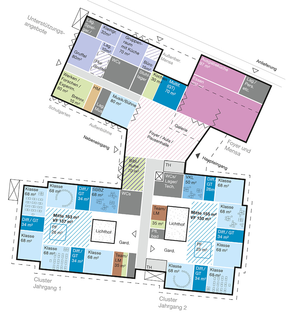 Ziel des Projekts ist es, ein Schulgebäude zu entwickeln, das den heutigen pädagogischen Anforderungen gerecht wird – von individuellem und erfahrungsorientiertem Lernen über Ganztagsbetreuung und Inklusion bis hin zu differenzierten Lernformen und gemeinschaftlichem Arbeiten. Damit gehen neue qualitative Anforderungen an Räume und Lernumgebungen einher, die über klassische Klassen- und Fachräume hinausreichen und Konzepte wie Cluster oder „Klassenraum plus“ einbeziehen.