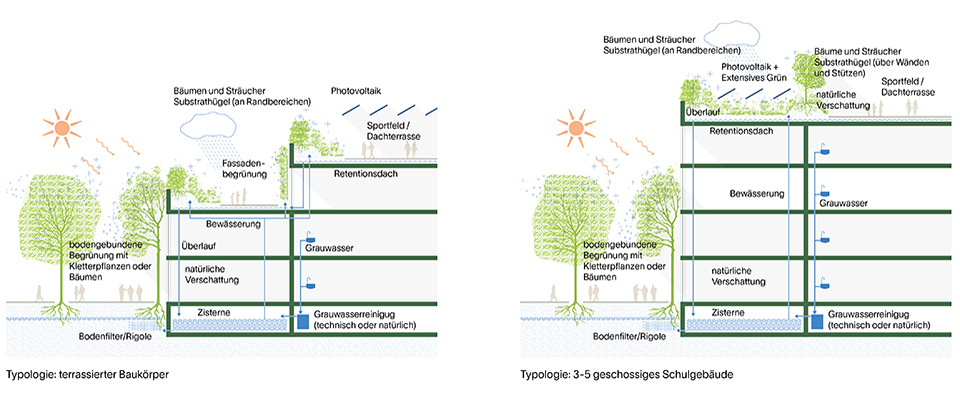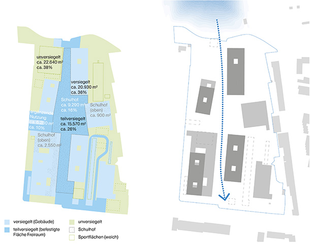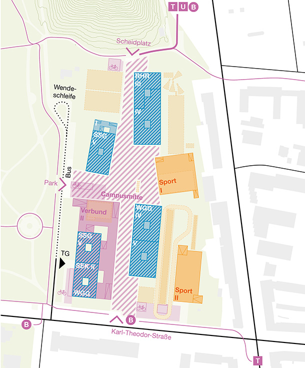 Die Nutzungsverteilung folgt in beiden Ansätzen einem gemeinsamen Prinzip: Die schulischen Eigennutzungen sind jeweils eigenständigen Gebäuden zugeordnet, während gemeinschaftliche Funktionen in einem zentralen Campushaus gebündelt werden, das zugleich als Schnittstelle zur Öffentlichkeit fungiert. In die städtebauliche Struktur sind zudem die unterirdischen U-Bahn-Trassen sowie die von Norden einwirkenden Kaltluftströme integriert.
