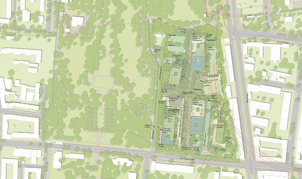Beide Konzepte verstehen den Schulcampus als urbanes, zugleich grünes Quartier mit einer klaren Mitte und starkem Bezug zum angrenzenden Park. Eine differenzierte Freiraumstruktur schafft dabei eine abgestufte Öffentlichkeit – von den einzelnen Schulbereichen über gemeinschaftlich genutzte Verbundräume bis hin zu offenen Stadträumen. Aufgrund der bestehenden Wohnbebauung im Osten öffnet sich das Areal gezielt nach Norden zum Luitpoldhügel und Scheidplatz, nach Westen zum Park und nach Süden zur Karl-Theodor-Straße.