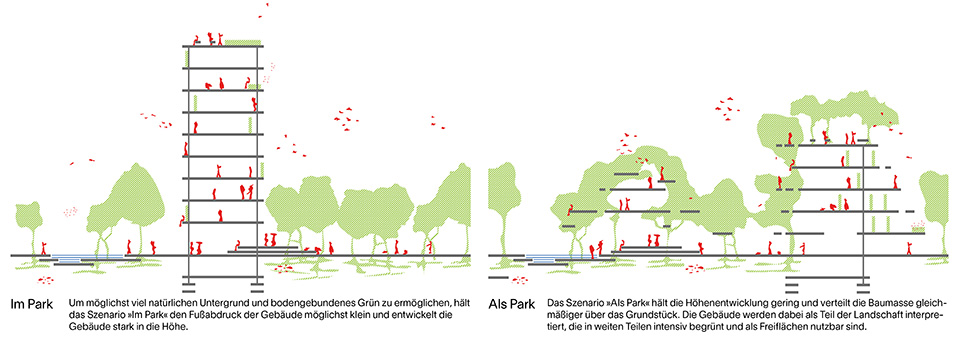 Im Sinne einer doppelten Innenentwicklung verfolgen beide Konzepte das Ziel, zusätzliche Baumasse zu schaffen und gleichzeitig den Grünanteil zu erhöhen. Unterschiedlich beantwortet wird dabei die zentrale Frage nach dem Verhältnis von Bebauung und Park: der Bildungscampus IM oder ALS Park?