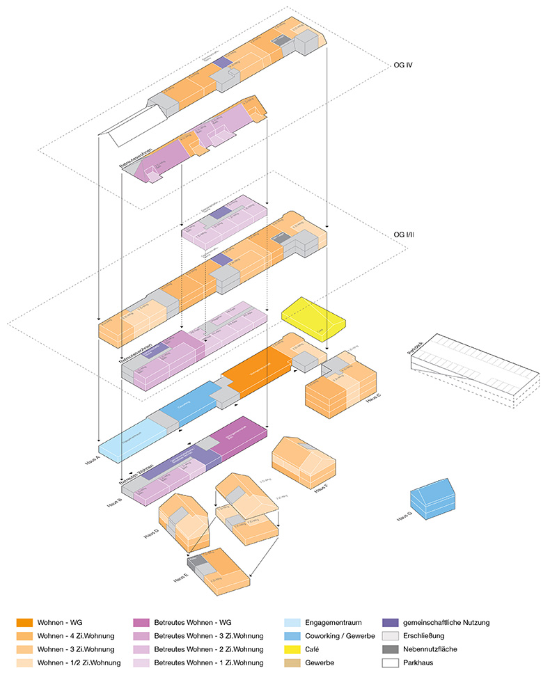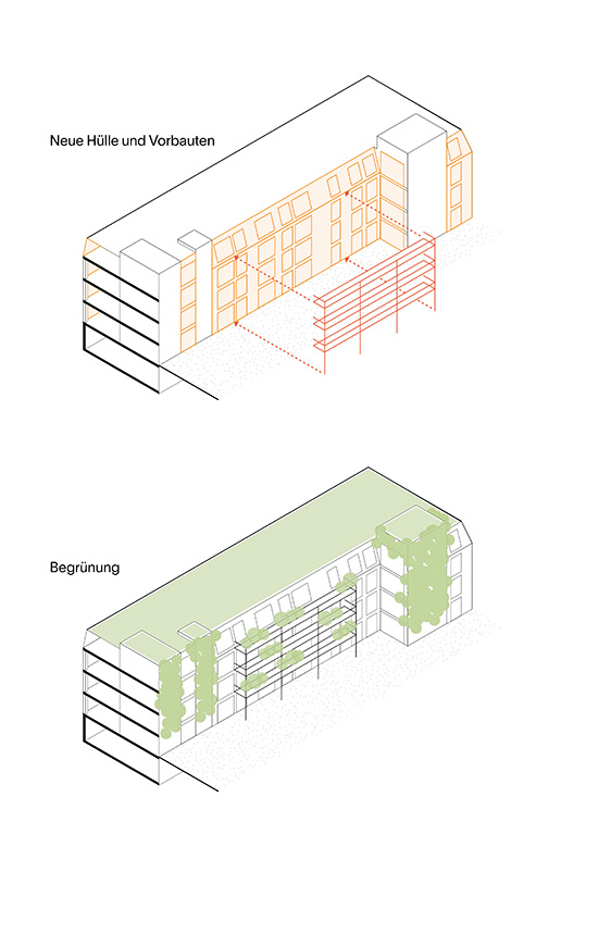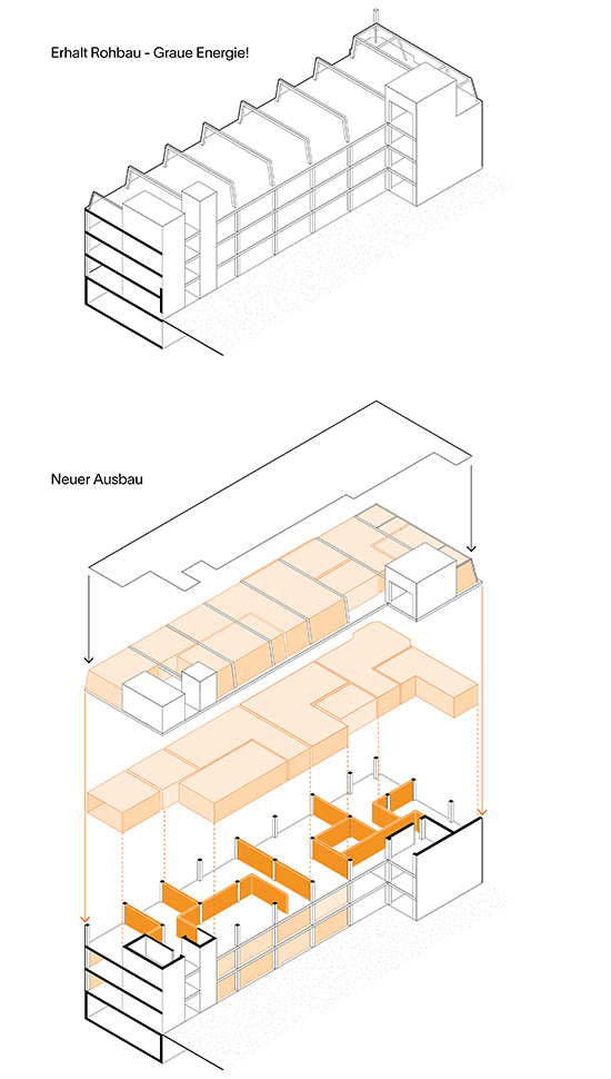 Die robuste Stahlbetonskelettstruktur ermöglicht flexible neue Nutzungen und bewahrt zugleich große Mengen grauer Energie. Bestehende Gebäude werden umgenutzt, ergänzt und energetisch ertüchtigt, neue Bauteile in nachhaltiger Holzbauweise hinzugefügt. Insgesamt entstehen rund 90 Wohnungen, darunter auch Angebote für betreutes Wohnen, ergänzt durch Coworking, Engagementräume und gewerbliche Nutzungen. Photovoltaik, begrünte Dächer und Fassaden sind integraler Bestandteil des Energiekonzepts.
