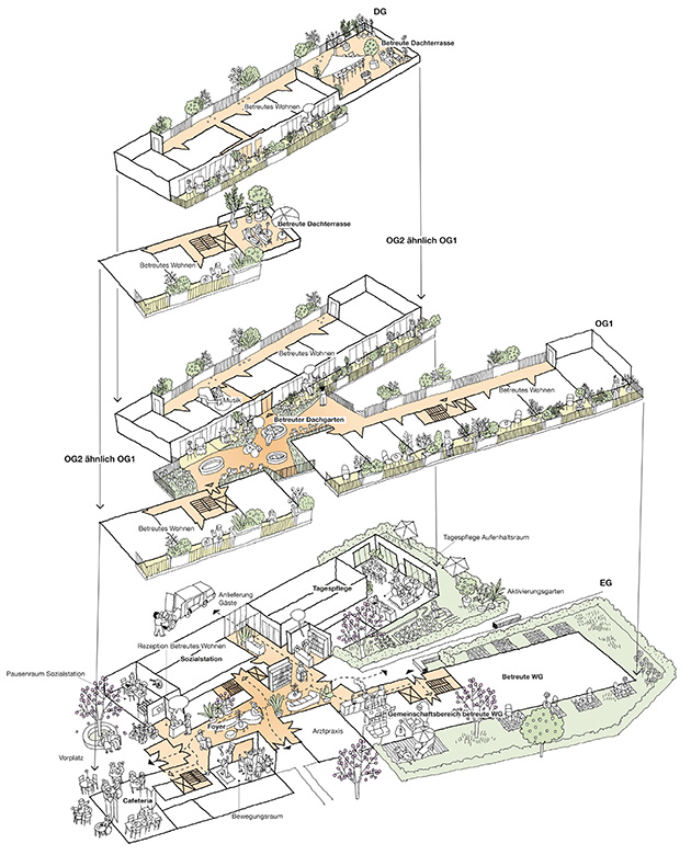 In landschaftlich prägnanter Lage entsteht am Ortseingang von Dätzingen ein neues Quartier für barrierearmes und generationenübergreifendes Wohnen mit Angeboten für Betreuung, Pflege und medizinische Versorgung. Das Gebäudeensemble greift die Maßstäblichkeit und Topografie des Ortes auf, öffnet sich zur Landschaft und bildet gemeinsam mit einem neuen Platz einen identitätsstiftenden Auftakt zur zentralen Aktivitätszone.
