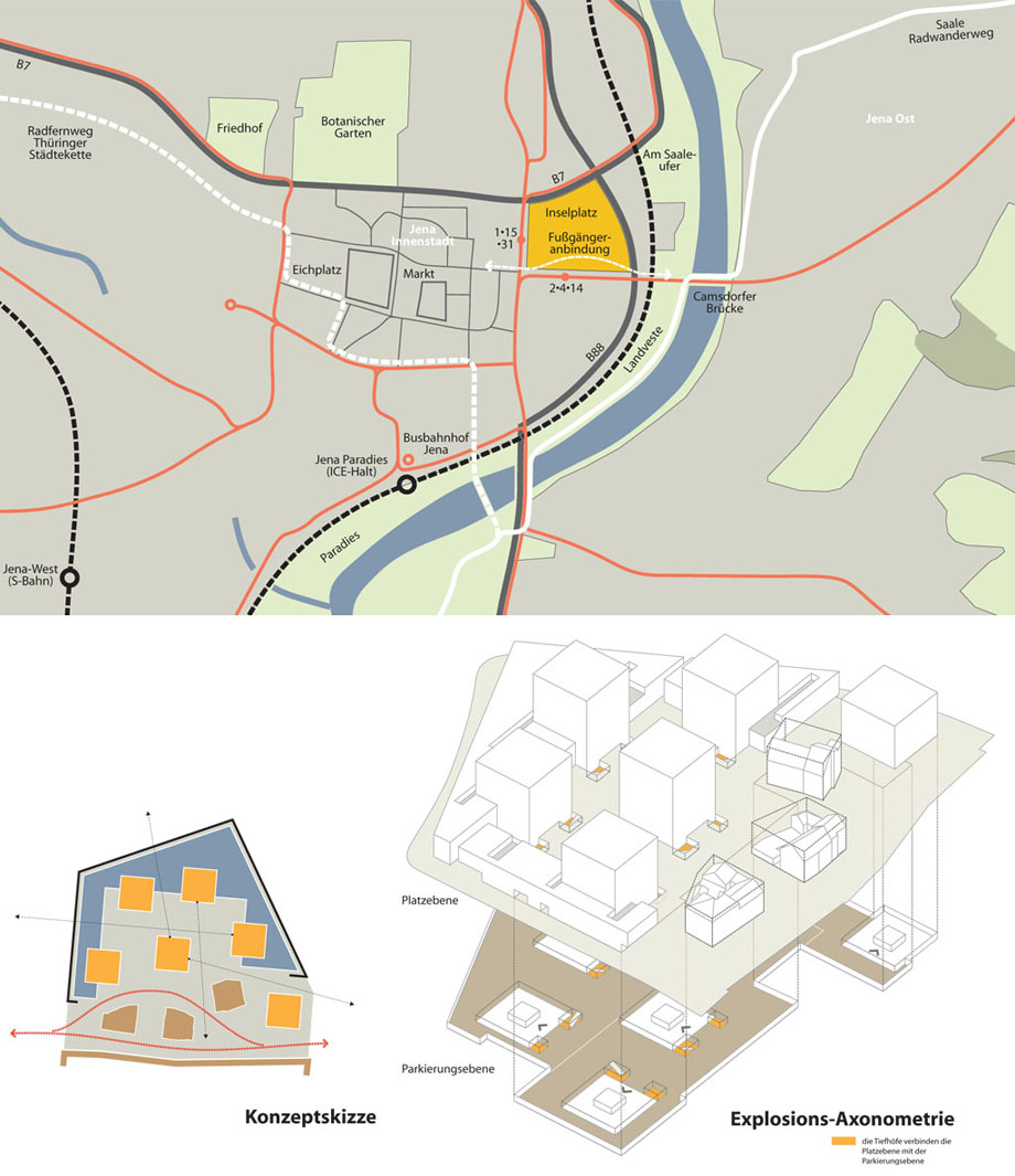 Der vorliegende Entwurf interpretiert den Inselplatz als städtischen Raum, der als östlicher Eingang zur Innenstadt zukünftig eine gewichtige Rolle im baulichen und freiräumlichen Gefüge der Stadt Jena spielen wird. Es entwickelt sich hier ein neues Quartier mit einzigartigen Atmosphären und Nutzungsmöglichkeiten, das durch seine Durchlässigkeit in Ost-West Richtung einen wichtigen Trittstein zwischen Innenstadt und Saaleaue sowie den östlichen Stadtgebieten darstellt.