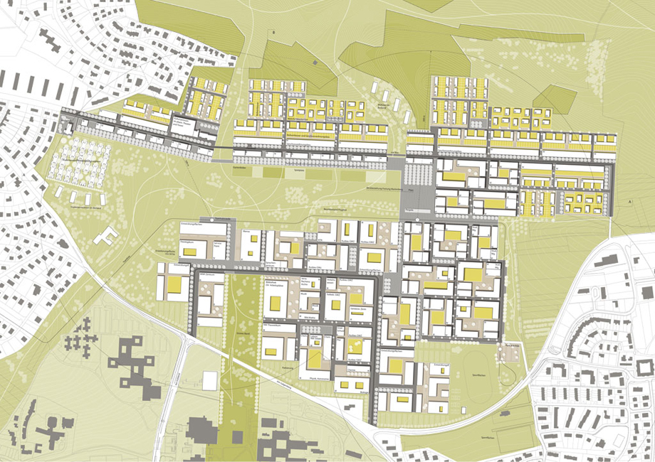 Um den gemeinsamen Freiraum entwickeln sich Quartiere, die durch ein Netz aus Gärten, Höfen, Gassen, Straßen und Plätzen eine Vielzahl unterschiedlicher privater, halböffentlicher und öffentlicher Freiräume entstehen lässt.