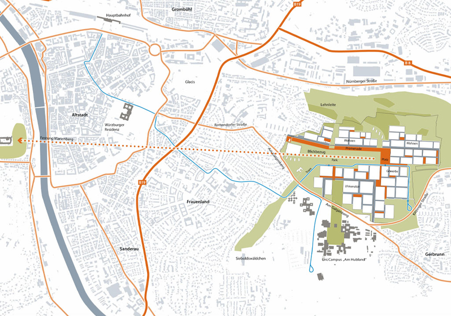 Die Entwicklung des Gebietes als Wohnstandort in Form eines neuen Quartiers mit mehreren Tausend Einwohnern wird begleitet von der Universitätserweiterung im Süden des Geländes. Die geplante Vergrößerung des Campus Am Hubland stellt aufgrund seiner zu erwartenden Eigendynamik für den zukünftigen Prozess eine große Chance dar. Ebenso kann die geplante Landesgartenschau die rasche Entwicklung des Areals unterstützen. Diese Hauptaspekte bilden die Grundlage für das vorliegende Entwurfskonzept.