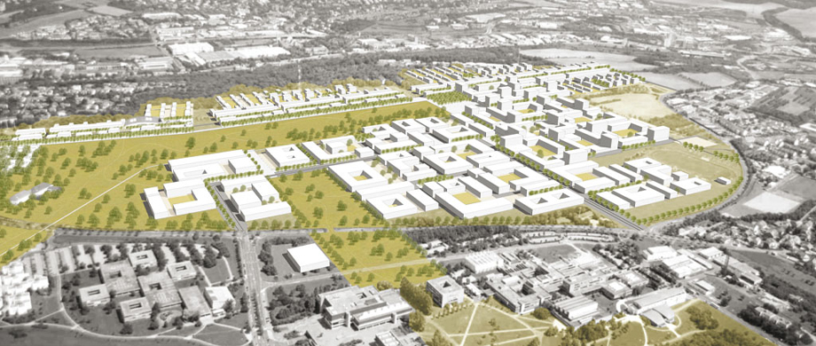 Im Süden entsteht die Erweiterung der Universität schrittweise. Die freiräumliche Anbindung erfolgt über ein grünes Band, das aus der Mitte des bestehenden Campus über die Straße in den neuen Universitätsbereich führt. Angrenzend an das Universitätsviertel entsteht ein Mischgebiet mit dem Schwerpunkt Dienstleistung und Gewerbe. Hier spielt einerseits die Nähe zur Universität eine wichtige Rolle, um Synergien zwischen Lehre, Forschung und Wirtschaft zu nutzen. Andererseits können die Firmen von der Nähe zu hochwertigen Wohnquartieren profitieren, die hervorragend sowohl fußläufig als auch über Radwege angebunden sind. Auch städtische Wohnformen sind in den höheren Gebäuden vorgesehen. Um den zentralen Platz entstehen neben weiteren Gewerbeflächen vorwiegend zentrale Nutzungen, die diesen Bereich als urbane Aktivitätszone kennzeichnen. Gastronomie, Einzelhandel, Kultur, öffentliche Einrichtungen, Hotels etc. verdichten sich hier zu einem Zentrum. Dieser Nutzungsmix setzt sich entlang der Promenade nach Westen fort, verschiebt sich hier jedoch in Richtung Freizeit und hochwertigem Wohnen.