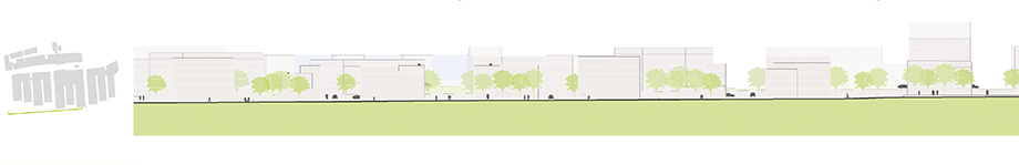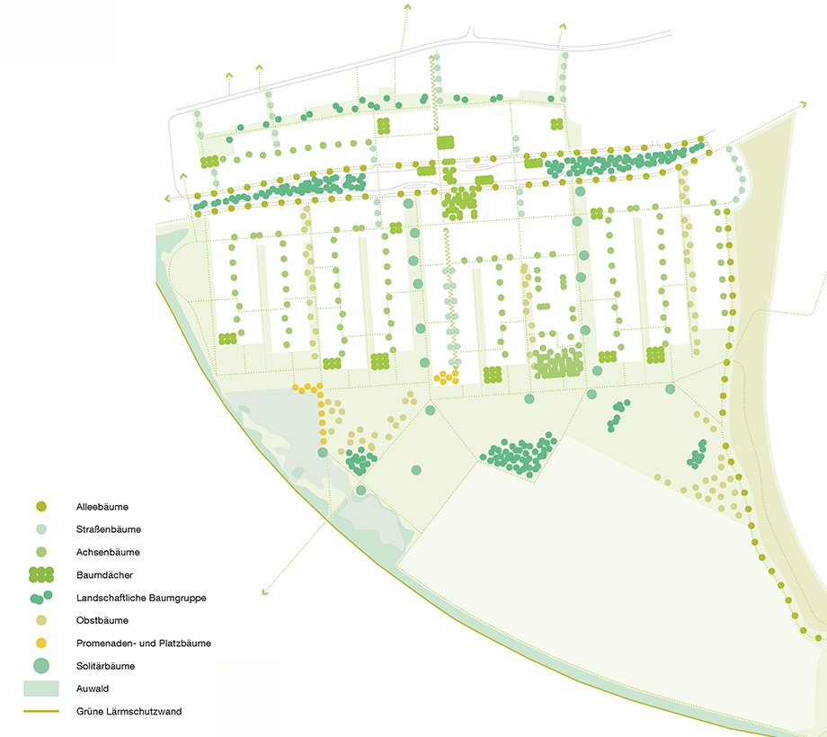 Blick durch die Wohnstraße in den Landschaftspark im Süden