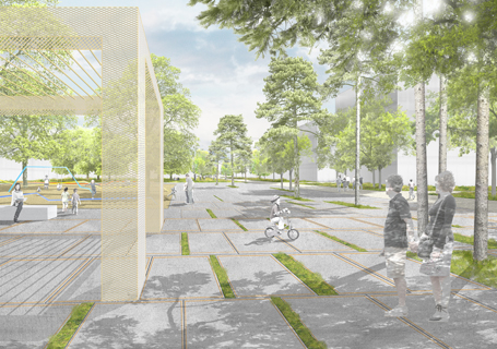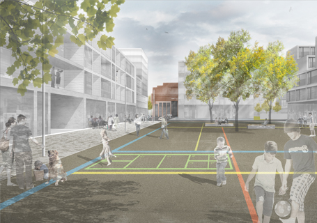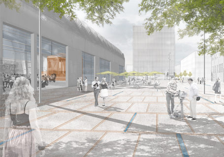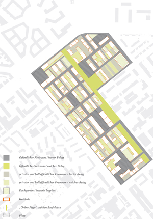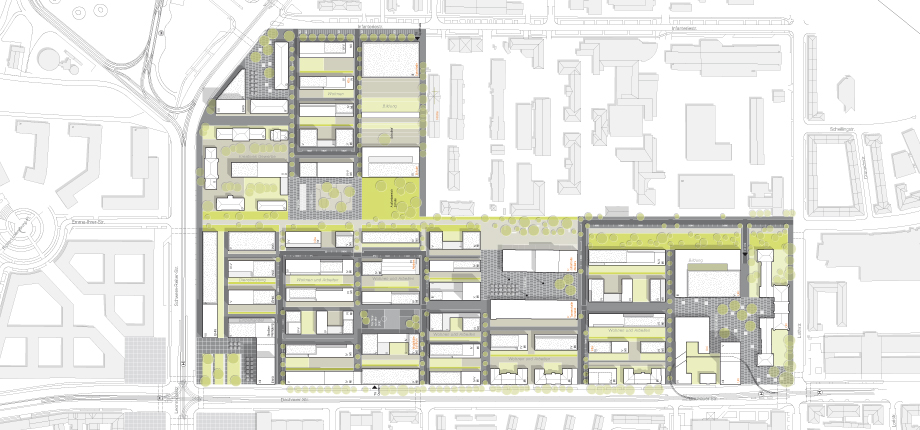 Die Entwurfskonzeption orientiert sich am Leitbegriff einer „Spezifischen Unbestimmtheit“ - Erschließungs- und Freiräume bilden einen fest definierten Rahmen, der im Gegenzug Vielfalt und individuelle Entwicklungsmöglichkeiten auf einzelnen Baufeldern ermöglicht. Während dort äußere Raumkanten, Bebauungsdichte und Durchlässigkeiten festgelegt werden, sind bezüglich Binnendifferenzierung, Nutzungsmix und Typologie individuelle Setzungen erwünscht