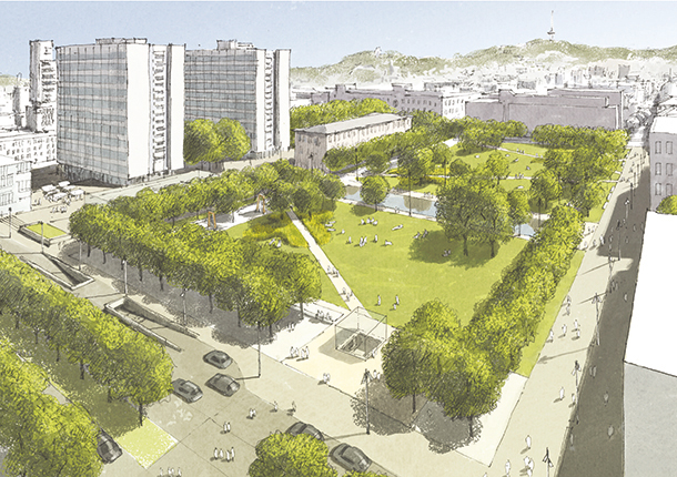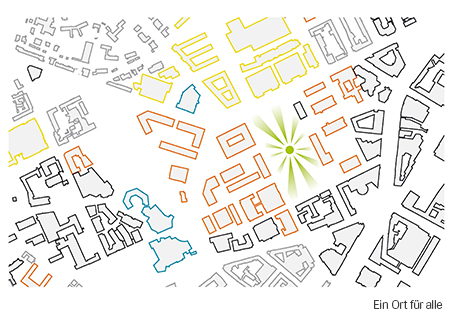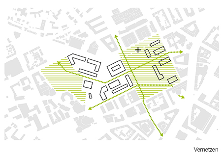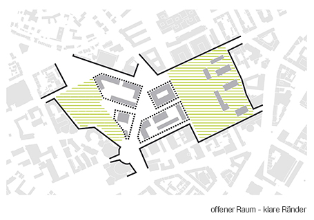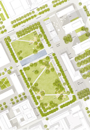 grüner Hanglage werden räumlich aufgegriffen und im zentralen Entwurfsbereich neu interpretiert. Denkmalgeschützte Gebäude wie K1, K2 und das Rektoramt werden in das Konzept eingebettet. Auf dem verbleibenden Campusgebiet werden klar begrenzte Streifen definiert, in denen eine bauliche Entwicklung und Verdichtung stattfinden kann. Auf beiden Seiten der Kollegiengebäude werden neue städtische Räume angeboten, die auch dem Campusleben dienen. Ebenso wichtig jedoch ist ihre neue Funktion als informelle Orte städtischen Lebens. Das Umfeld von Rektoramt und HfT wie auch der Bibliothek wird als urbane Empfangszone gestaltet. In der Summe wird ein differenziertes Netz städtischer Freiräume geschaffen, das unterschiedliche Orte profiliert – aber auch als zusammenhängendes Areal gelesen werden kann. Der Entwurf verzichtet dabei darauf, durchgehend eigene bauliche Ränder zu schaffen – Ziel ist vielmehr die umliegenden „Stadtansichten“ mit in die Transformation einzubeziehen.