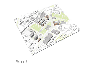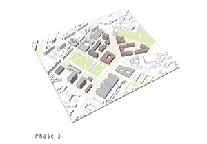 Die bauliche Weiterentwicklung des Gesamtgebietes kann schrittweise erfolgen. Einzelgebäude können innerhalb des stabilen Gerüstes bei Bedarf ersetzt und der Campus an zukünftige Entwicklungen angepasst werden. Hervorzuheben ist der Standort zwischen Bibliothek und HfT an dem ein markantes Gebäude zum Park den Wandel zusätzlich sichtbar machen und das Image des Bildungsortes mit prägen könnte.