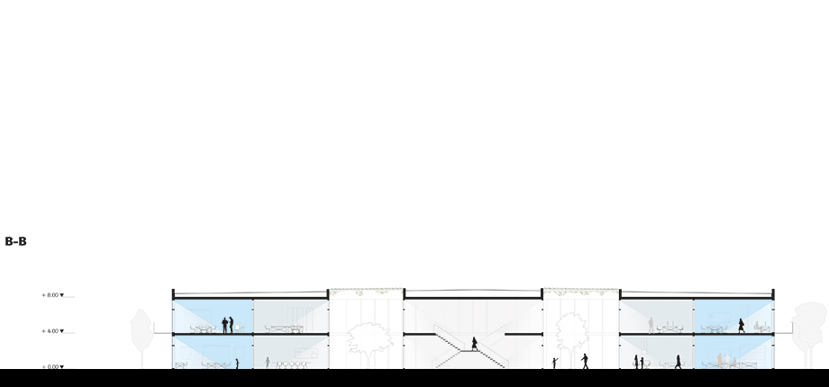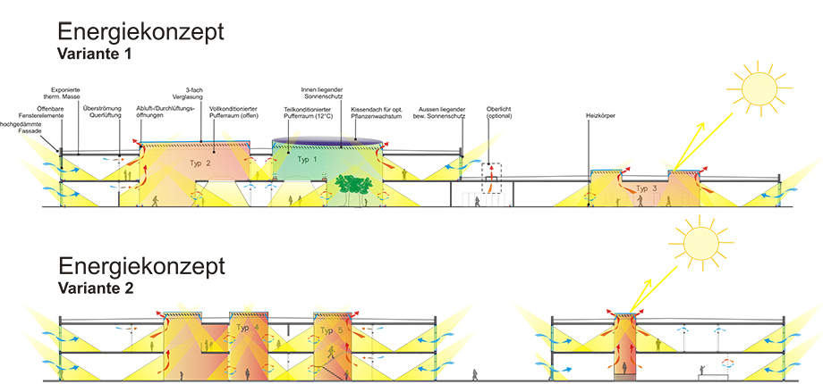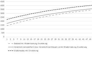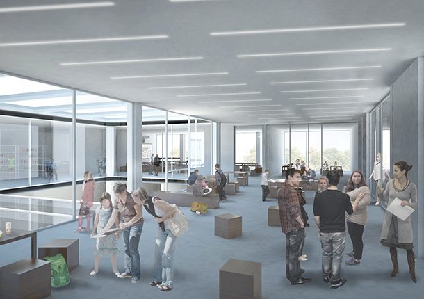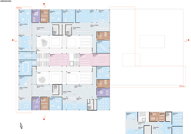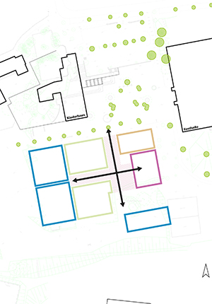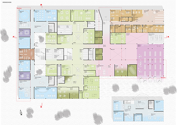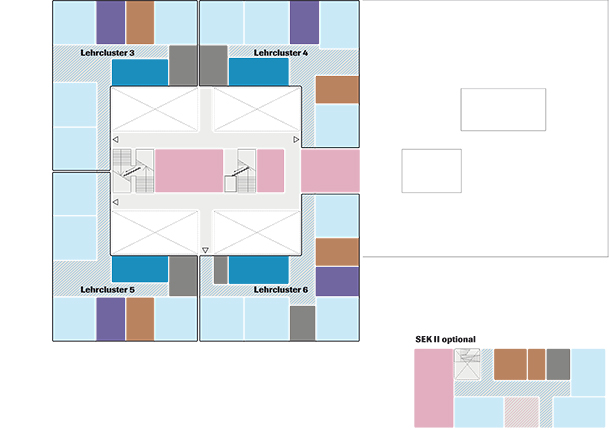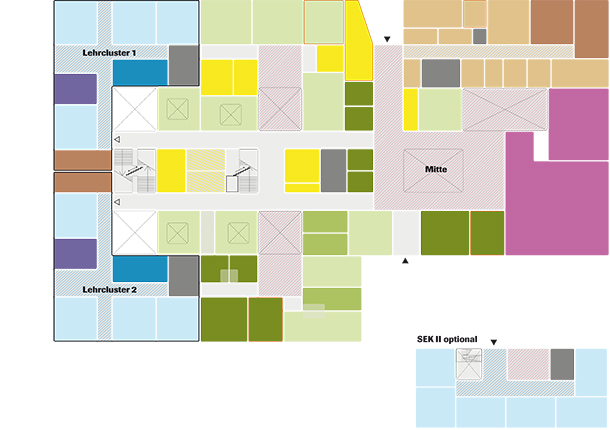 Im Zuge einer Machbarkeitsstudie sollte daher untersucht werden, welche Möglichkeiten bestehen, die vorhandene Gebäudestruktur an die Herausforderungen von morgen anzupassen. Dabei spielen Clusterbildung und Zonierung eine genauso wichtige Rolle wie eine Aktivierung der überaus weiträumigen Erschließungsbereiche. Es gilt im Lernort Kommunikations- und Differenzierungsbereiche zu schaffen und dafür zu sorgen, dass Ganztagsbereiche in das Haus genauso integriert werden wie kommunikative Treffpunkte und Orte für gelebte Gemeinschaft.