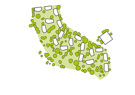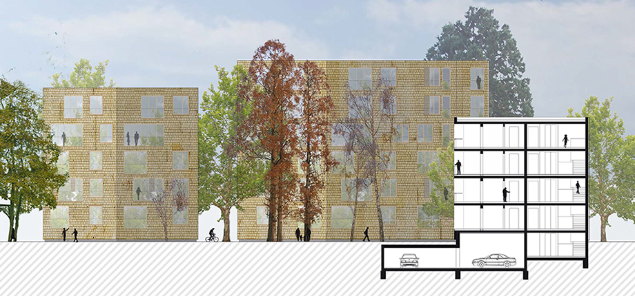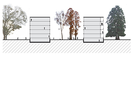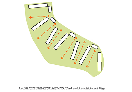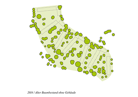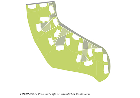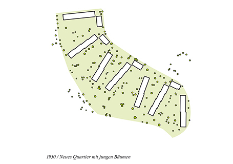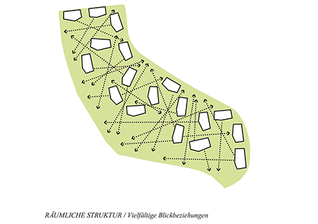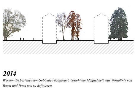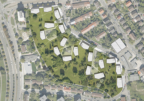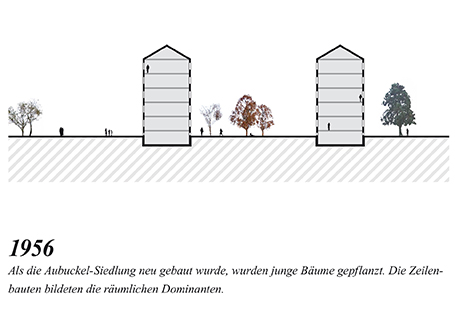In den 50er Jahren enstand im Nordosten Mannheheims die Siedlung Aubuckel. Die vormals modernen Gebäude müssen heute ersetzt werden. Großes räumliches und atmosphärisches Potential des Ortes ist der zahl- und artenreichen Baumbestand. Das Gelände liegt in der Nähe des künftigen BUGA-Geländes, was seine Attraktivität noch weiter steigert. Die neue Bebauung nimmt die Struktur der vorhandenen Zeilenbebauung auf, interpretiert diese aber in Form von Einzelhäusern neu. Die neuen Bauten fügen sich behutsam in den Baumbestand ein, lassen weitläufigere Blicke zu und schaffen eine neue fließende Durchwegung: Die zukünftigen Bewohner schauen nicht nur auf Bäume - sie wohnen im Park. Die Häuser gruppieren sich um vielfältig gestaltete Höfe mit Aufenthalts- und Erholungsbereichen. Durch den vorhandenen Baumbestand, nur punktuelle Nutzung und verschiedene Bodenbeläge wird der Übergang von Hof zu freier Parkfläche fließend gestaltet. Das Wegenetz gliedert die Flächen in intensiv und extensiv nutzbare Bereiche und verbindet die verschiedenen Grünbereiche und die Gebäude mit dem Straßenraum.