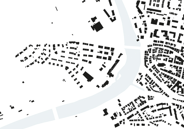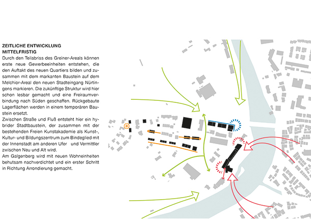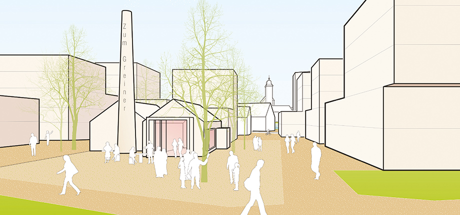 Das Greinerareal entwickelt sich Schritt für Schritt von einem Produktions- und Logistikstandort zu einem durchmischten Stadtquartier für Wohnen, Arbeiten und Freizeit. Die städtebauliche Struktur orientiert sich einerseits am Vorgefundenen, um während des Umbauprozesses flexibel bleiben zu können, wenn es um Fragen von Umnutzung und Neubau geht. Andererseits greift es die besonderen Potenziale des Ortes auf. Die streifenartige Bebauung differenziert die privaten, halböffentlichen und öffentlichen Freiräume und ermöglicht gleichzeitig besondere Blickbezüge zur Innenstadt und der Kirche. Die bereits begonnene verdichtete Wohnstruktur wird hangabwärts fortgesetzt und entwickelt sich über mischgenutzte Bausteine zu flexiblen Gewerbeeinheiten, die auch den Abschluss zur Neckarstraße bilden.