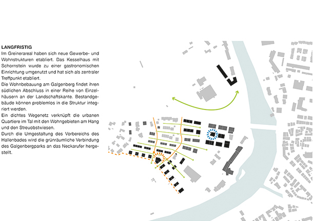 Durch die Umgestaltung des Vorbereichs des Hallenbades wird der Galgenbergpark an das Neckarufer angebunden. Die Uferpromenade öffnet sich am Melchiorareal zu einem großzügigen Platzbereich mit direktem Bezug zum Wasser und der Innenstadt. Über einen Grünzug durch das Greinerareal ist dieser Bereich direkt mit dem Galgenbergpark verbunden. Die neue Wohnbebauung am Galgenberg ist durchzogen von Grünstreifen mit ökologischen Funktionen sowie hohen Aufenthaltsqualitäten und steht in direkter Beziehung zu den Streuobstwiesen.