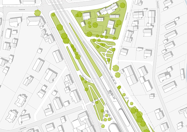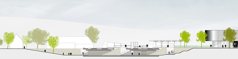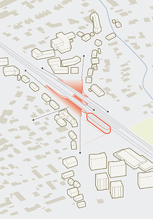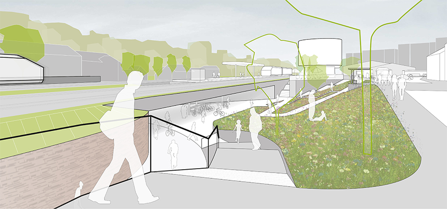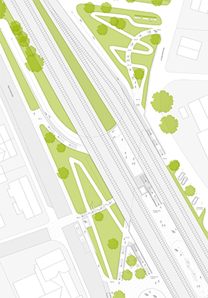Mit dem Bau einer Unterführung für Fußgänger und Radfahrer bietet sich für die Stadt Senden eine große Chance, die zwei von der Bahnlinie getrennten Stadtteile miteinander zu verbinden. Die geplante Maßnahme ist in erster Linie ein städtebauliches Projekt mit großer Bedeutung für die gesamte Stadt. Das vorliegende Konzept schafft an zentraler Stelle einen neuen qualitätsvollen öffentlichen Ort, der neben seiner Funktion als Wegeverbindung und Verkehrsknoten auch besondere räumliche Qualitäten und Angebote zum Verweilen schafft. Die Unterführung wird als Landschaft ausgestaltet, deren Charakter von Offenheit, Helligkeit und Grün geprägt ist. Ausgangspunkt für die Planung bildet die Öffnung der historischen Verbindung des Landgrabenweges. Die Umgestaltung des Bahnhofsumfeldes ermöglicht die direkte Anbindung der heutigen Bahnhofstraße an den gegenüberliegenden Landgrabenweg. Der Rückbau der bestehenden Gebäude westlich der Bahngleise inklusive des Bahnhofsgebäudes schafft die Möglichkeit für eine öffnende Geste zu beiden Seiten der Bahngleise und eine großzügige Verbindung mit Anbindung an alle bestehenden Wegeverbindungen. Ein neues Bahnhofsgebäude gibt dem Ort eine starke Identität und schafft einen räumlichen Rücken für den Busbahnhof. Neben Wartehalle, Ticketverkauf, Kiosk und gastronomischen Angeboten im Erdgeschoss sind in den oberen Geschossen unterschiedliche Nutzungen (Büros, Sport- und Freizeitangebote etc.) denkbar.