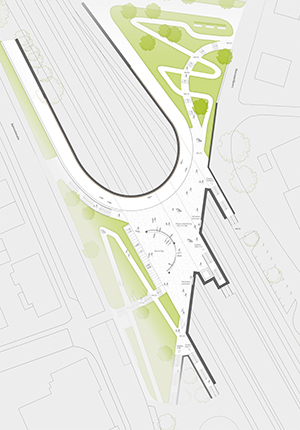 Die Park+Ride Plätze sind östlich der Bahngleise am Verbindungsweg zum Stadtpark abseits anderer Funktionen mit Parkplatzbedarf angeordnet. Sowohl die Verbindung zu den südlich gelegenen Wohngebieten und Seen als auch die zu den westlich gelegenen Stadtgebieten und dem Stadtzentrum werden direkt in die neue Unterführung geführt. Auf der Ostseite wird der Landgrabenweg in beide Richtungen zur Ortsstraße und zum Stadtpark ohne Umwege angebunden.