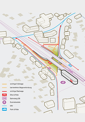 Der Bahnhofsbereich mit der Unterführung wird in Zukunft einen wichtigen Verkehrsknoten in Senden darstellen. Neben der Verbindung der beiden Stadtteile ermöglicht er den Zugang zu Bussen und Bahnen und bildet damit eine wichtige Schnittstelle zwischen den unterschiedlichen Verkehrsarten und ermöglicht so ganz selbstverständlich multimodale Wegeketten. Die Nutzung von Bus und Bahn wird in diesem Konzept durch das zusätzliche Angebot einer Bike&Ride-Station noch attraktiver und