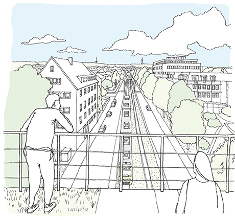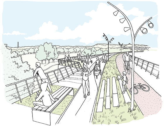 Über die Verbindungsfunktion hinaus bietet der Panoramaweg aufgrund seiner erhöhten Lage besondere räumliche Qualitäten und neue spektakuläre Aussichten auf die Stadt und die Region.