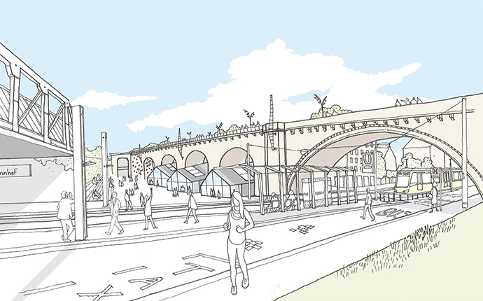 Der Wegfall eines Großteils der Gleisflächen entlang des Gleisbogens und seine zukünftige Nutzung als Fuß- und Radweg eröffnet auch neue Möglichkeiten für die Nutzung der Bauwerke selbst und der angrenzenden Flächen. In der Verlängerung der Nordbahnhofstraße und nicht weit von den Wagenhallen könnte am Viadukt ein neuer Platz entstehen und so eine ehemalige Restfläche zu einem attraktiven öffentlichen Raum mit besonderer Atmosphäre werden lassen. Das Nördliche Überwerfungsbauwerk und das Viadukt bieten dabei als Bauwerke auch selbst interessante Ausbau- und Nutzungsmöglichkeiten.