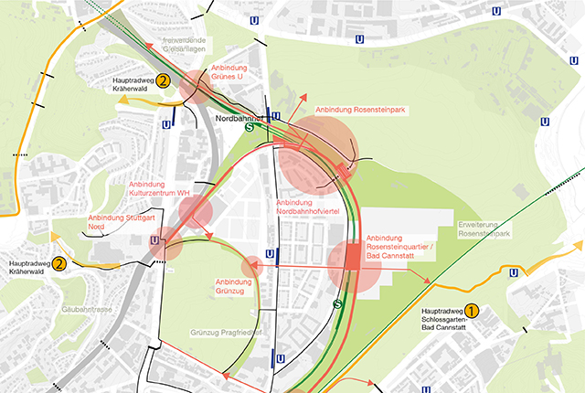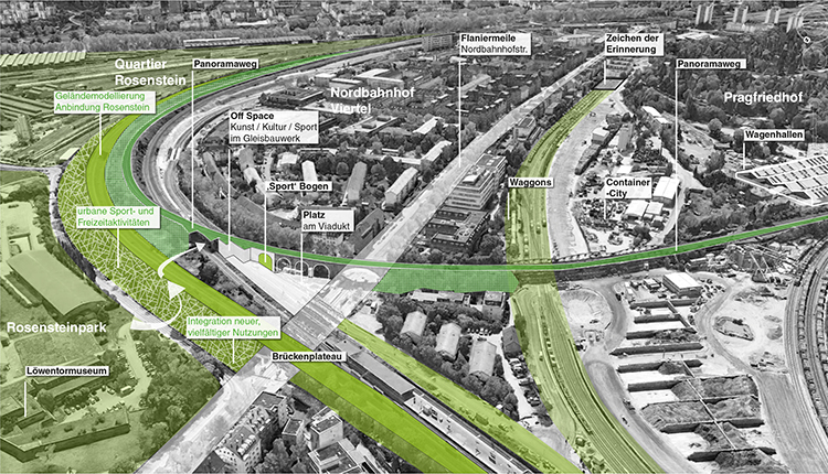 Es ergeben sich direkte Wegeverbindungen vom Stuttgarter Norden über den Verkehrsknoten am Eckhartshaldenweg und das Kulturzentrum Wagenhalle in den Rosensteinpark, das Nordbahnhofviertel, das neue Rosensteinquartier, den Stuttgarter Osten, nach Bad Cannstatt und über den Bahnhof weiter ins Stadtzentrum. Der neue geschaffene „Panoramaweg“ soll dabei durch eine sanfte Modellierung des Gleisgebirges bis zur Mittnachtstraße auf die Höhe des geplanten Platzes an der Schnittstelle von Nordbahnhofviertel und Rosensteinquartier gebracht werden, um diesen zukünftig zentralen Ort möglichst gut in das Wegenetz einzubinden.