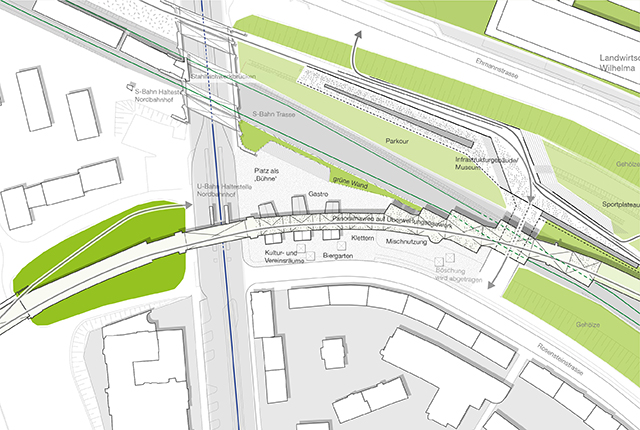 Nördlich der verbleibenden S-Bahntrasse werden Flächen frei, die sehr gut dafür geeignet wären, mit niederschwelligen Bewegungsangeboten und ergänzenden kulturellen Nutzungen den Übergang zwischen Quartier und Park zu qualifizieren.