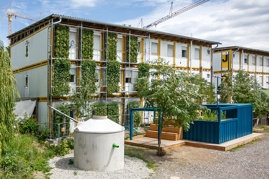 In direkter Nachbarschaft zu temporären Arbeiterunterkünften für das Infrastrukturprojekt Stuttgart 21 wird das in den Duschen und Handwaschbecken der Unterkünfte entstehende Grauwasser von in einem Bodenfilter aufbereitet und in Verbindung mit Regenwasser zur Bewässerung von Fassadenbegrünung an den Wohncontainern eingesetzt.