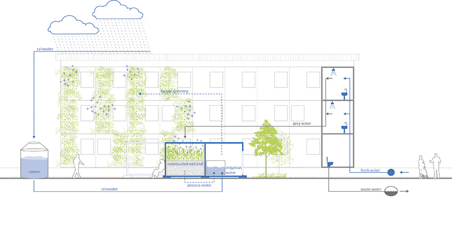 Die temporären Unterkünfte eignen sich besonders gut für eine Grauwassernutzung: Die Installation ist gut zugänglich, aufwendige und teure Eingriffe in die Bausubstanz sowie Erdarbeiten fallen nur in einem geringen Umfang an.