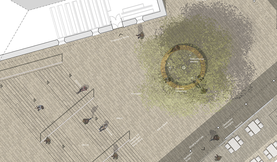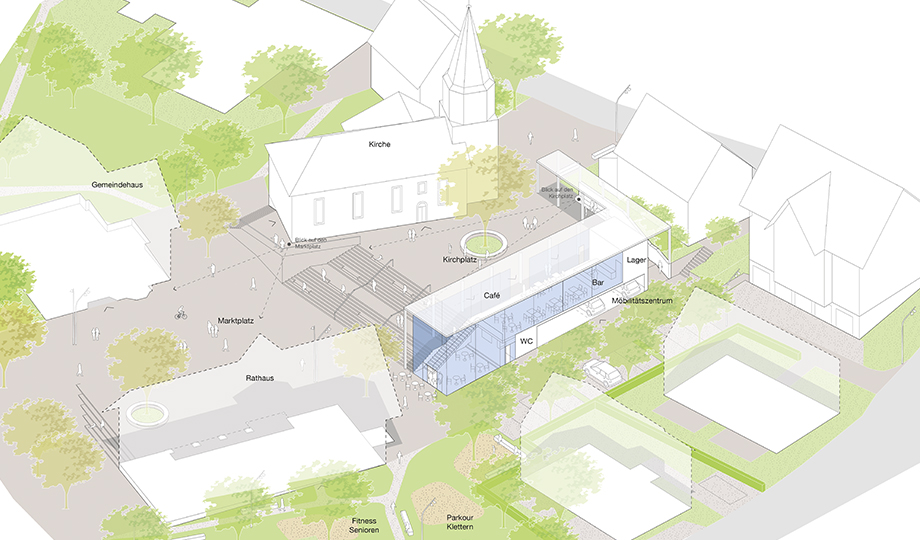 Der Kirchplatz wird sowohl von der bestehenden Kirche als auch von einem neugebauten Café und Veranstaltungsraum gefasst, der sich über einen überdachten Außenbereich zum Platz öffnet. Zusammen mit einer zentralen Kastanie und Sitzmöglichkeiten entsteht so ein Ort der sich sowohl für kirchliche Feste, einen Sektempfang nach der Hochzeit oder zum alltäglichen Verweilen im Schatten eignet.