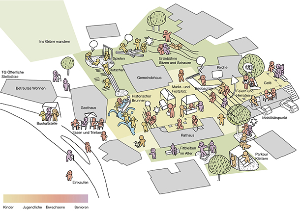 Die differenzierte Gestaltung der Ortsmitte schafft sehr unterschiedliche Atmosphären und macht vielfältige Angebote für eine heterogene Nutzerschaft.