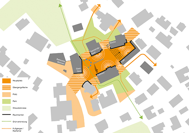 Der Marktplatz ist durch seine Offenheit und Größe für Feste, Markt und Jahrmarkt multifunktional nutzbar. Die Nutzungen von Rathaus, Gemeindehaus und Gastronomie öffnen sich zum Platz und bespielen ihn. Am Übergang zur Hauptstraße entstehen in zwei im Erdgeschoß verbundenen neuen Bausteinen ein Wirtshaus und Betreutes Wohnen mit Tagespflege.
