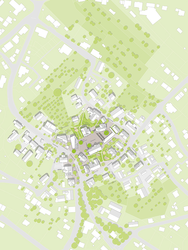 Öffentliche Grünräume um das Gemeindehaus im Norden und das Rathaus im Süden begleiten den Platz und schaffen Bewegungs- und Rückzugsorte für Jung und Alt.
