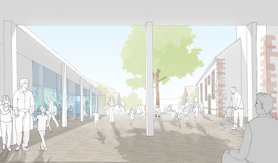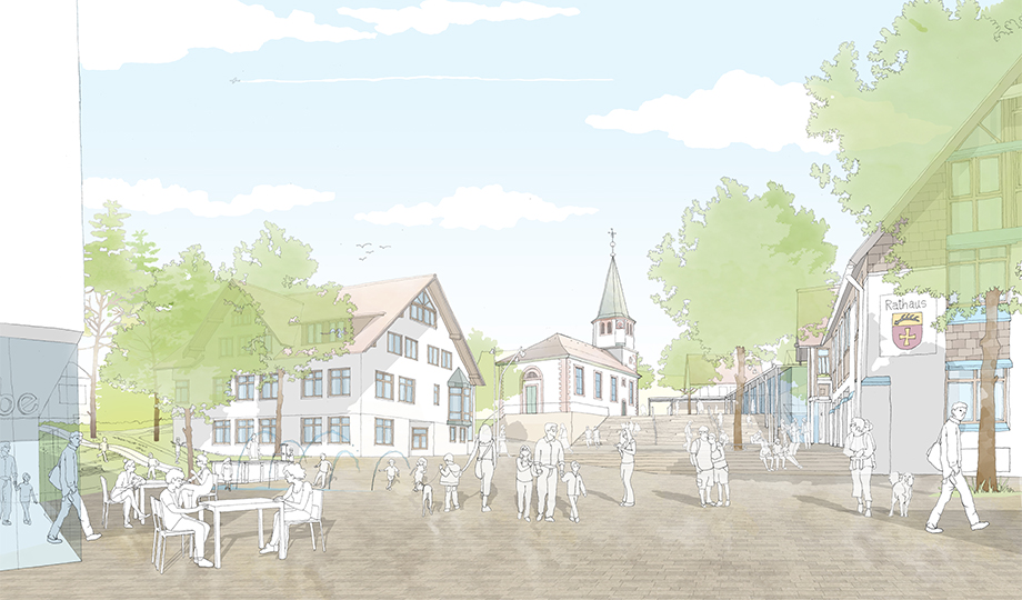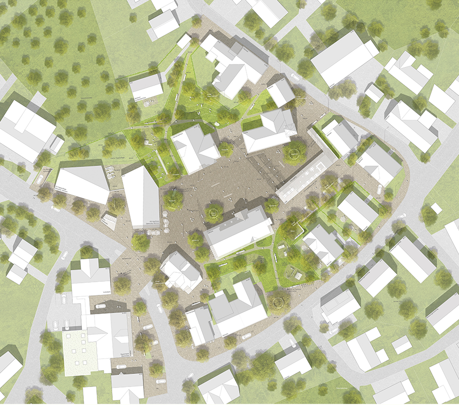 Ein großer, zusammenhängender Platz zwischen Rathaus, Kirche, Gemeindehaus und den neuen Bausteinen schafft die neue Ortsmitte. Die wichtigen, öffentlichen Gebäude fassen und bespielen das „Herz“ von Schopfloch.