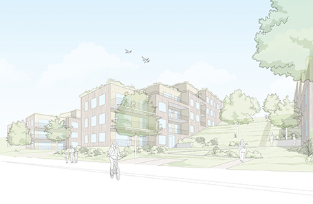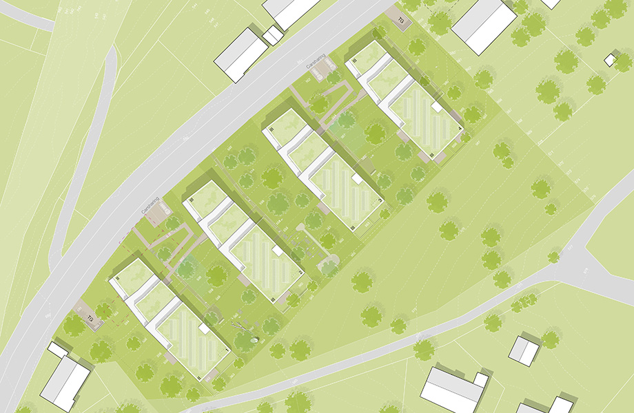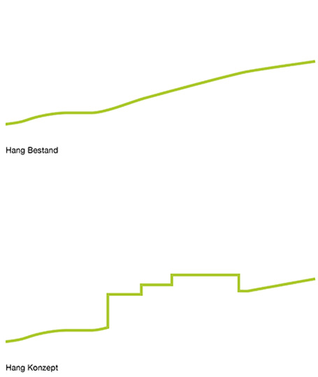 Die Gebäude folgen mit ihrer Höhenstaffelung dem Hang. Die intensiv begrünten Dächer verstärken den landschaftlichen Charakter des Ensembles und leisten einen wichtigen Beitrag zur Ökologie (Retention, Biodiversität).