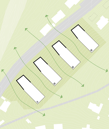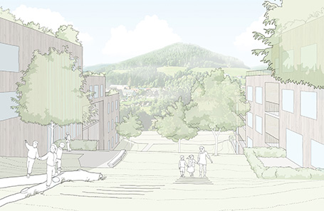 Der grüne Hang bleibt erhalten und bildet gemeinschaftliche Freiräume für die Bewohner mit spektakulären Blickbeziehungen über Baiersbronn in die Umgebung.
