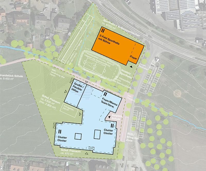 Die Stadt Schwäbisch Hall plant im Ortsteil Hessental den Neubau einer fünfzügigen Grundschule mit Ganztagesbereich und Sporthalle. Der neue Standort am Stadtrand, in unmittelbarer Nähe der Hohenloher Molkerei, ersetzt die bisherige Schule in der Wirtsgasse und schafft die Grundlage für einen zeitgemäßen Bildungsstandort.