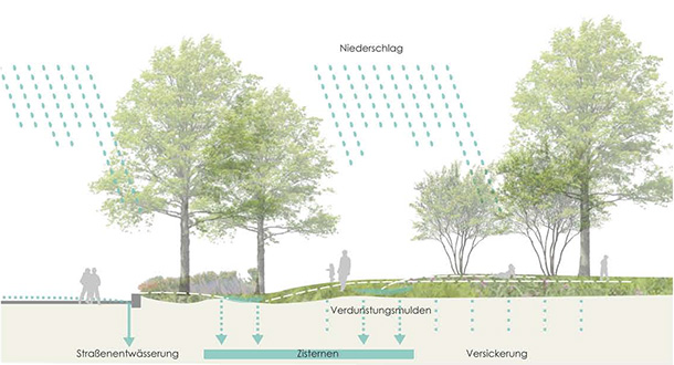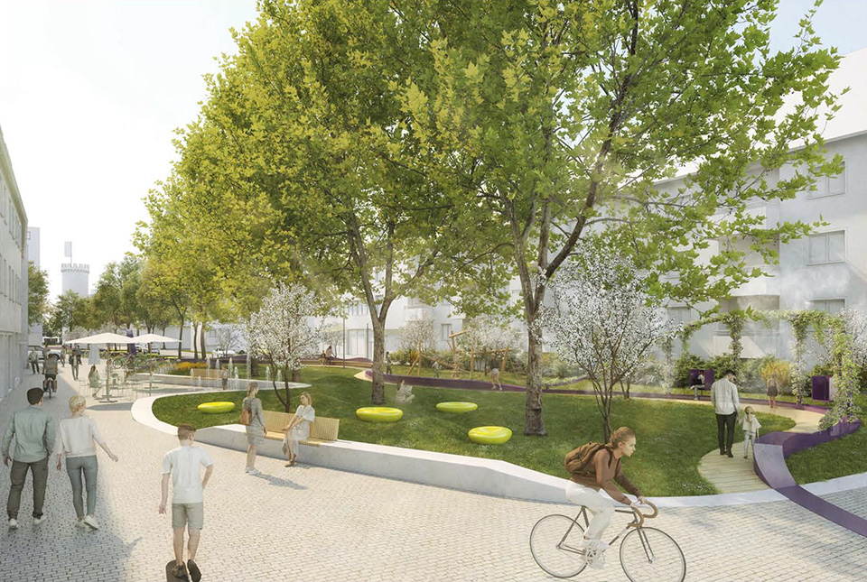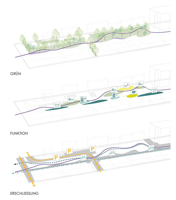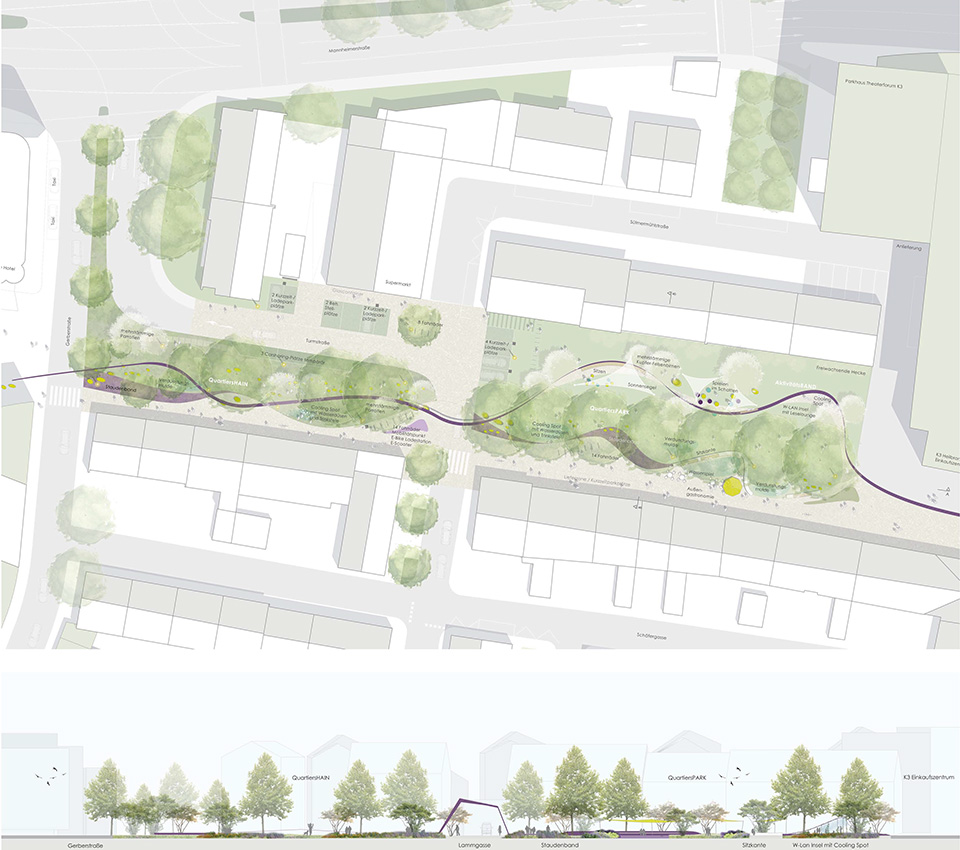 Im Mittelpunkt steht die Verbindung einer intensiven Begrünung mit klar reduzierten, funktional durchdachten Flächen zu vielfältigen, hochwertigen und teilweise autofreien Stadträumen. Als gestalterisches Leitmotiv verbindet das „lila Band“ beide Bereiche, stiftet Identität und schafft eine zusammenhängende Raumfolge mit unterschiedlichen Charakteren – eine „einheitliche Vielfalt“.