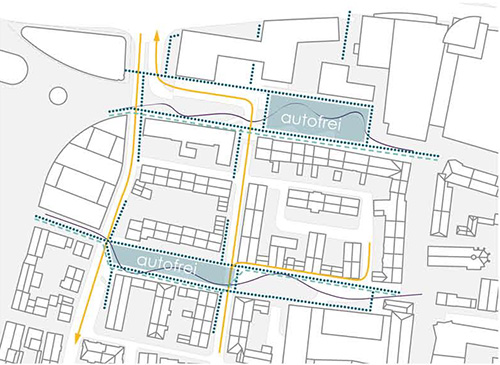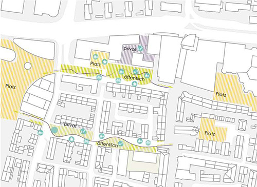 Die Zehentgasse hingegen entwickelt sich als überwiegend autofreier, schattiger Rückzugsraum mit quartierstypischem Charakter. Als „Quartiersgarten“ stärkt sie die Innenstadt als Wohnort und zeichnet sich durch einen hohen Anteil entsiegelter Flächen aus. Entlang des verbindenden Bandes ergänzen Angebote wie Trinkbrunnen, Wasserzerstäuber, Beleuchtung und Sitzgelegenheiten die Aufenthaltsqualität und unterstützen eine alltagstaugliche Nutzung.