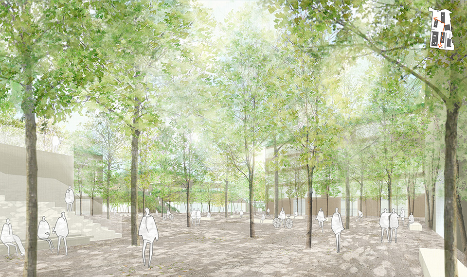 Beide Konzepte verstehen den Schulcampus als urbanes, zugleich grünes Quartier mit einer klaren Mitte und starkem Bezug zum angrenzenden Park. Eine differenzierte Freiraumstruktur schafft dabei eine abgestufte Öffentlichkeit – von den einzelnen Schulbereichen über gemeinschaftlich genutzte Verbundräume bis hin zu offenen Stadträumen. Aufgrund der bestehenden Wohnbebauung im Osten öffnet sich das Areal gezielt nach Norden zum Luitpoldhügel und Scheidplatz, nach Westen zum Park und nach Süden zur Karl-Theodor-Straße.