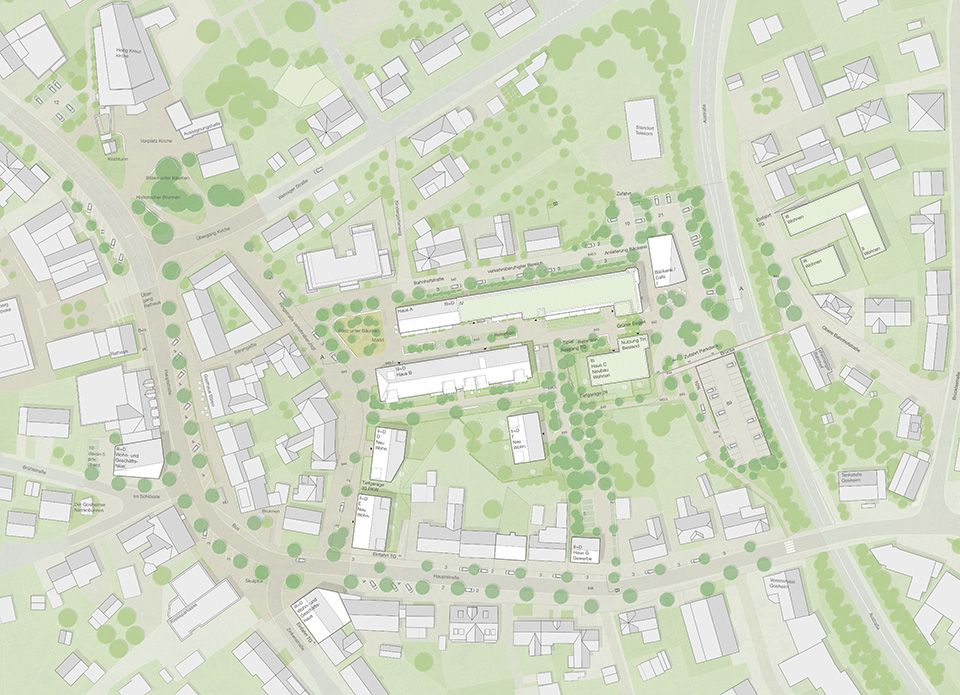 Mit der Neuordnung der angrenzenden Straßenräume, zusätzlichen Grünstrukturen und neuen Platzsituationen wird auch das Umfeld deutlich aufgewertet. So entsteht ein identitätsstiftendes Stück Stadt, das Wohnen, Arbeiten, Begegnung und Nachhaltigkeit verbindet und die Ortsmitte Gosheims langfristig stärkt.