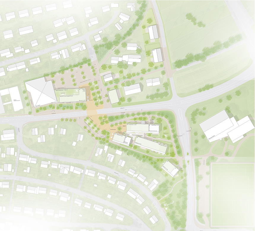Nördlich der Straße wird der bestehende Nahversorger erweitert und mit Wohnnutzungen überbaut. Ergänzende Wohn- und Geschäftsbauten sowie neue Wohnhäuser im Umfeld der historischen Mühlengebäude vervollständigen den neuen Ortseingang und fügen sich in die vorhandene Körnung ein.