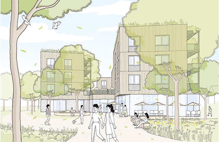 Südlich der Döffinger Straße bündelt ein Ensemble aus mehreren Baukörpern das Generationenwohnen mit Tagespflege, Sozialstation, Arztpraxis und gemeinschaftlichen Angeboten. Ein zentraler Eingangs- und Begegnungsbereich mit Foyer, Bibliothek und Cafeteria bildet das Herz des Projekts und fördert Austausch und Teilhabe. Die Wohnungen sind über großzügige Laubengänge erschlossen, ergänzt durch Gemeinschaftsräume und Dachterrassen mit weitem Landschaftsblick. Die Gebäude werden in nachhaltiger Holz-Hybridbauweise realisiert.